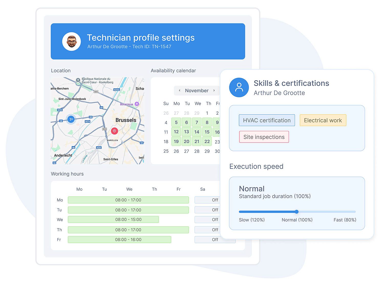 Movetex houdt rekening met alles wat je buitendienst beïnvloedt: start- en stoplocaties, werktijden, pauzes, verlof, beschikbaarheid en vaardigheden of certificaten waarover je medewerker beschikt.