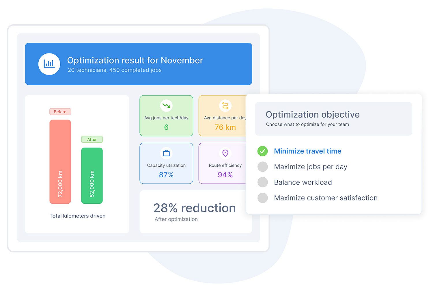 Maar er is nog meer. Je kunt het algoritme ook afstemmen op je eigen doelen: zo min mogelijk kilometers, zoveel mogelijk jobs per dag, werkdruk gelijk verdelen over het team, of maximale klanttevredenheid door tijdsvensters altijd te respecteren. Aan jou de keuze!