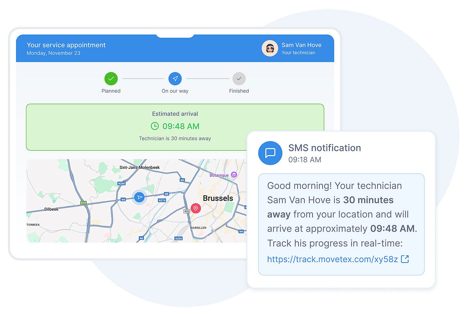 Op de dag van de afspraak stuurt Movetex automatisch een mail of sms naar je klanten met een accurate aankomsttijd, live aangepast aan de werkelijke voortgang van je buitendienst.