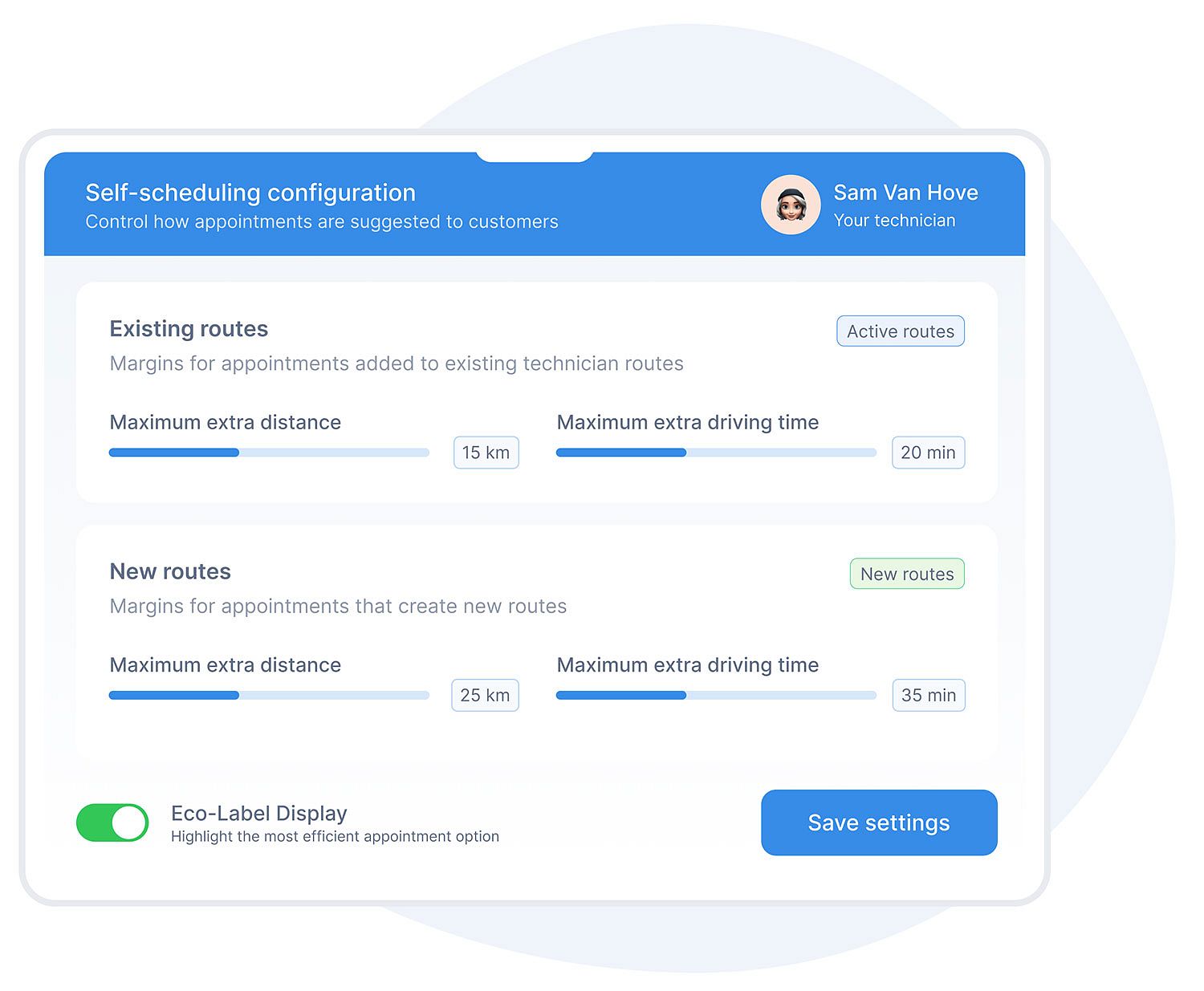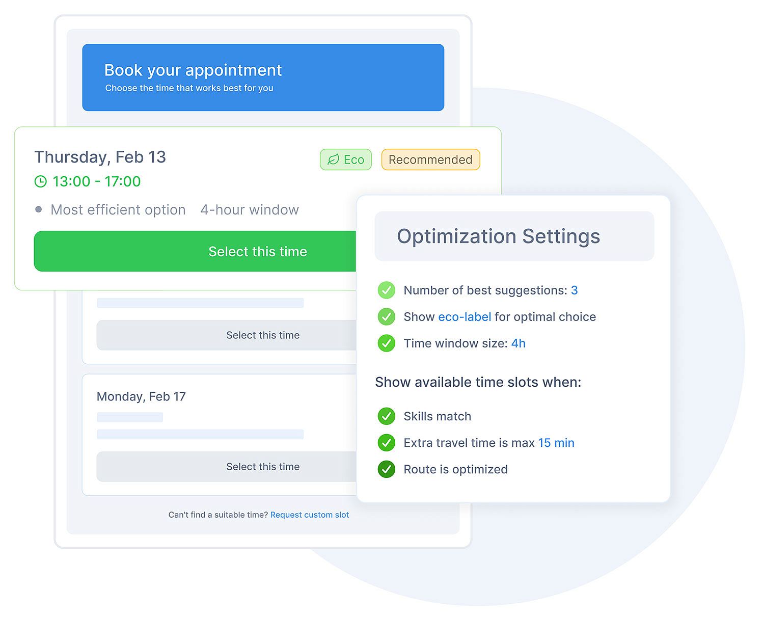 Klanten zien enkel dagen en tijdslots die écht efficiënt zijn voor jouw planning, rekening houdend met beschikbaarheid, vereiste vaardigheden, SLA’s en minimale rijtijd.