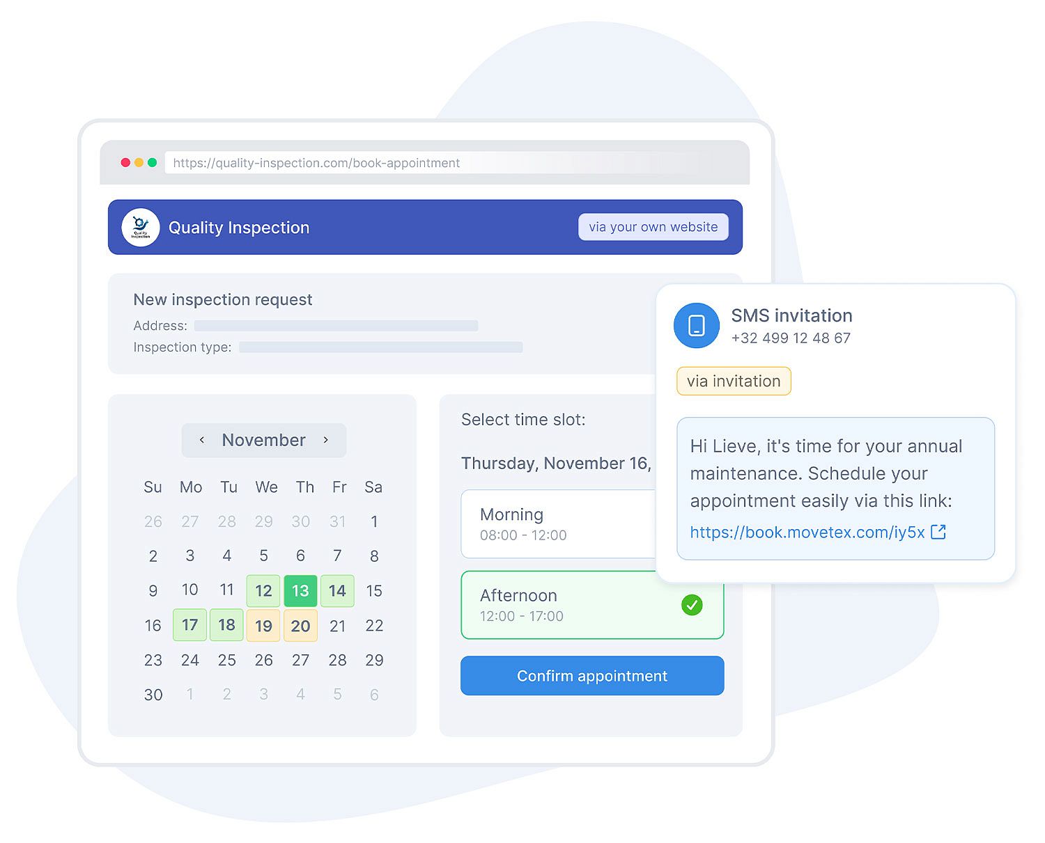 Laat klanten zelf hun afspraak boeken via een plugin op je eigen website of jouw klantenportalen. Ideaal voor eenmalige aanvragen zoals inspecties, herstellingen, of expertises.